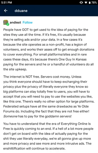 OP was taking about Tumblr, but I think it applies even more to the Fediverse: users need to develop an ethos of paying to support the sites they use. Otherwise advertisers pay the bills and call the shots.